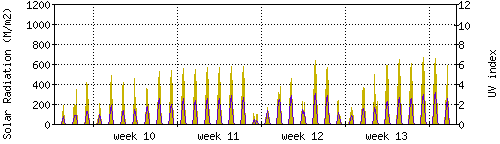 Das goldene Histogramm zeigt die totale Sonnestrahlung in W/m^2, die Skala befindet sich am linken Rand. Die violette Kurve zeigt den UV index, mit der Skala am rechten Rand. Man beachte, dass nach Schneefall die Messwerte nicht zuverlässig sind, weil die Sensoren nicht automatisch vom Schnee befreit werden. |