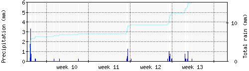 Das blaue Histogram zeigt die totale Niederschlagsmenge (oder deren Wassergehalt) in mm während des Messintervals. |