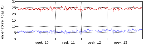 Die rote Kurve zeigt die Innentemperatur,die hellrote Fläche zeigt den Bereichh zwischen höchster und tiefster Temperatur während des Messzeitraums. |