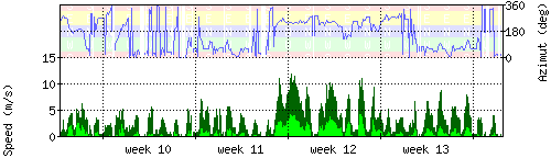 Der untere Teil des Graphen zeigt in hellgrün die mittlere Windgeschwindigkeit, die Spitzengeschwindigkeit ist dunkelgrün dargestellt, die zugehörige Skala findet sich am linken Rand. Der obere Teil des Graphen zeigt das Wind-Azimut in blau, die Skala steht am rechten Rand. |