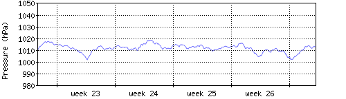 Der blaue Graph zeigt den mittleren Luftdruck, der Bereich zwischen grösstem und kleinstem Druck während des Messintervals ist in hellblau dargestellt. |