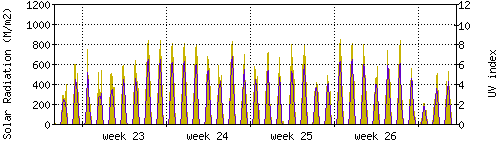 Das goldene Histogramm zeigt die totale Sonnestrahlung in W/m^2, die Skala befindet sich am linken Rand. Die violette Kurve zeigt den UV index, mit der Skala am rechten Rand. Man beachte, dass nach Schneefall die Messwerte nicht zuverlässig sind, weil die Sensoren nicht automatisch vom Schnee befreit werden. |
