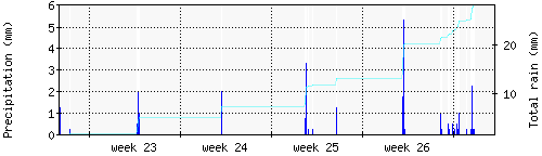 Das blaue Histogram zeigt die totale Niederschlagsmenge (oder deren Wassergehalt) in mm während des Messintervals. |