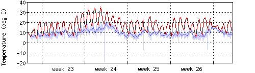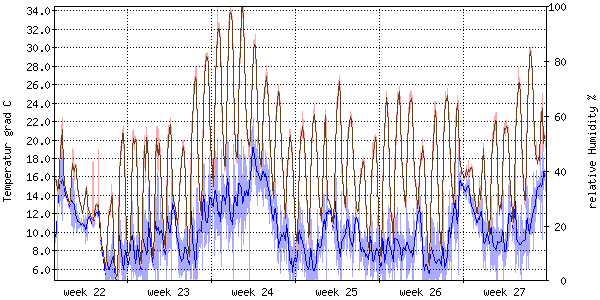 Die rote Kurve zeigt die Temperatur, die hellrote Fläche zeigt den Bereich zwischen höchsten und niedrigsten Temperatur während des Messintervals. Die blaue Kurve zeigt den Taupunkt, also die Temperatur, bei der sich Tau zu bilden beginnt. |