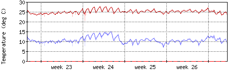 Die rote Kurve zeigt die Innentemperatur,die hellrote Fläche zeigt den Bereichh zwischen höchster und tiefster Temperatur während des Messzeitraums. |