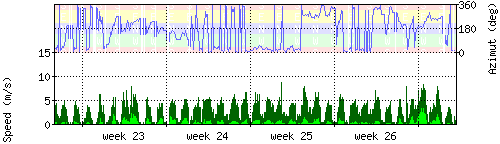 Der untere Teil des Graphen zeigt in hellgrün die mittlere Windgeschwindigkeit, die Spitzengeschwindigkeit ist dunkelgrün dargestellt, die zugehörige Skala findet sich am linken Rand. Der obere Teil des Graphen zeigt das Wind-Azimut in blau, die Skala steht am rechten Rand. |