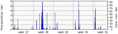 Das blaue Histogram zeigt die totale Niederschlagsmenge (oder deren Wassergehalt) in mm während des Messintervals. |