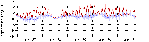 Die rote Kurve zeigt die Temperatur, die hellrote Fläche zeigt den Bereich zwischen höchsten und niedrigsten Temperatur während des Messintervals. Die blaue Kurve zeigt den Taupunkt, also die Temperatur, bei der sich Tau zu bilden beginnt. |
