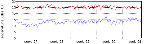 Die rote Kurve zeigt die Innentemperatur,die hellrote Fläche zeigt den Bereichh zwischen höchster und tiefster Temperatur während des Messzeitraums. |