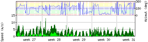 Der untere Teil des Graphen zeigt in hellgrün die mittlere Windgeschwindigkeit, die Spitzengeschwindigkeit ist dunkelgrün dargestellt, die zugehörige Skala findet sich am linken Rand. Der obere Teil des Graphen zeigt das Wind-Azimut in blau, die Skala steht am rechten Rand. |