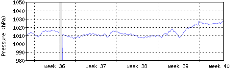 Der blaue Graph zeigt den mittleren Luftdruck, der Bereich zwischen grösstem und kleinstem Druck während des Messintervals ist in hellblau dargestellt. |