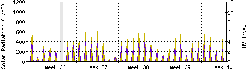 Das goldene Histogramm zeigt die totale Sonnestrahlung in W/m^2, die Skala befindet sich am linken Rand. Die violette Kurve zeigt den UV index, mit der Skala am rechten Rand. Man beachte, dass nach Schneefall die Messwerte nicht zuverlässig sind, weil die Sensoren nicht automatisch vom Schnee befreit werden. |