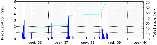 Das blaue Histogram zeigt die totale Niederschlagsmenge (oder deren Wassergehalt) in mm während des Messintervals. |