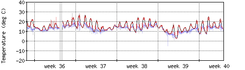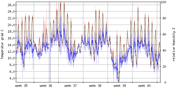 Die rote Kurve zeigt die Temperatur, die hellrote Fläche zeigt den Bereich zwischen höchsten und niedrigsten Temperatur während des Messintervals. Die blaue Kurve zeigt den Taupunkt, also die Temperatur, bei der sich Tau zu bilden beginnt. |