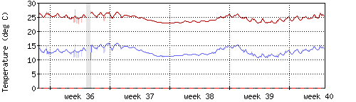 Die rote Kurve zeigt die Innentemperatur,die hellrote Fläche zeigt den Bereichh zwischen höchster und tiefster Temperatur während des Messzeitraums. |