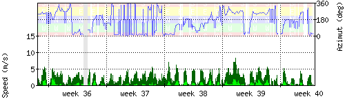 Der untere Teil des Graphen zeigt in hellgrün die mittlere Windgeschwindigkeit, die Spitzengeschwindigkeit ist dunkelgrün dargestellt, die zugehörige Skala findet sich am linken Rand. Der obere Teil des Graphen zeigt das Wind-Azimut in blau, die Skala steht am rechten Rand. |