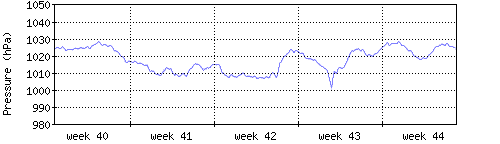 Der blaue Graph zeigt den mittleren Luftdruck, der Bereich zwischen grösstem und kleinstem Druck während des Messintervals ist in hellblau dargestellt. |