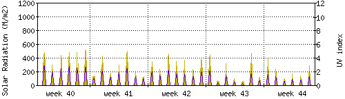 Das goldene Histogramm zeigt die totale Sonnestrahlung in W/m^2, die Skala befindet sich am linken Rand. Die violette Kurve zeigt den UV index, mit der Skala am rechten Rand. Man beachte, dass nach Schneefall die Messwerte nicht zuverlässig sind, weil die Sensoren nicht automatisch vom Schnee befreit werden. |