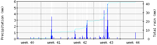 Das blaue Histogram zeigt die totale Niederschlagsmenge (oder deren Wassergehalt) in mm während des Messintervals. |