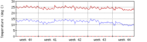 Die rote Kurve zeigt die Innentemperatur,die hellrote Fläche zeigt den Bereichh zwischen höchster und tiefster Temperatur während des Messzeitraums. |