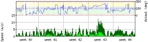 Der untere Teil des Graphen zeigt in hellgrün die mittlere Windgeschwindigkeit, die Spitzengeschwindigkeit ist dunkelgrün dargestellt, die zugehörige Skala findet sich am linken Rand. Der obere Teil des Graphen zeigt das Wind-Azimut in blau, die Skala steht am rechten Rand. |
