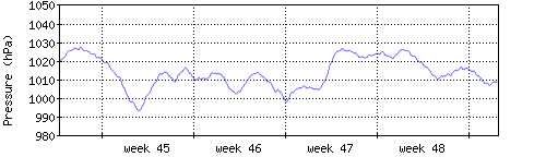Der blaue Graph zeigt den mittleren Luftdruck, der Bereich zwischen grösstem und kleinstem Druck während des Messintervals ist in hellblau dargestellt. |