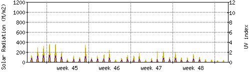 Das goldene Histogramm zeigt die totale Sonnestrahlung in W/m^2, die Skala befindet sich am linken Rand. Die violette Kurve zeigt den UV index, mit der Skala am rechten Rand. Man beachte, dass nach Schneefall die Messwerte nicht zuverlässig sind, weil die Sensoren nicht automatisch vom Schnee befreit werden. |