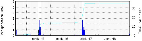 Das blaue Histogram zeigt die totale Niederschlagsmenge (oder deren Wassergehalt) in mm während des Messintervals. |