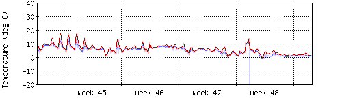 Die rote Kurve zeigt die Temperatur, die hellrote Fläche zeigt den Bereich zwischen höchsten und niedrigsten Temperatur während des Messintervals. Die blaue Kurve zeigt den Taupunkt, also die Temperatur, bei der sich Tau zu bilden beginnt. |