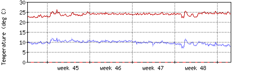 Die rote Kurve zeigt die Innentemperatur,die hellrote Fläche zeigt den Bereichh zwischen höchster und tiefster Temperatur während des Messzeitraums. |