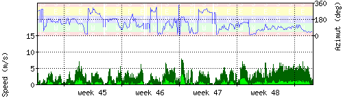 Der untere Teil des Graphen zeigt in hellgrün die mittlere Windgeschwindigkeit, die Spitzengeschwindigkeit ist dunkelgrün dargestellt, die zugehörige Skala findet sich am linken Rand. Der obere Teil des Graphen zeigt das Wind-Azimut in blau, die Skala steht am rechten Rand. |