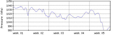 Der blaue Graph zeigt den mittleren Luftdruck, der Bereich zwischen grösstem und kleinstem Druck während des Messintervals ist in hellblau dargestellt. |