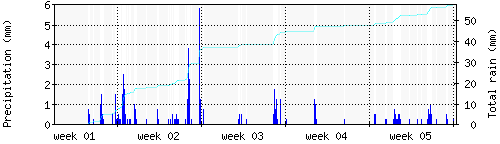 Das blaue Histogram zeigt die totale Niederschlagsmenge (oder deren Wassergehalt) in mm während des Messintervals. |