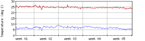 Die rote Kurve zeigt die Innentemperatur,die hellrote Fläche zeigt den Bereichh zwischen höchster und tiefster Temperatur während des Messzeitraums. |