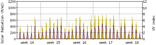 Das goldene Histogramm zeigt die totale Sonnestrahlung in W/m^2, die Skala befindet sich am linken Rand. Die violette Kurve zeigt den UV index, mit der Skala am rechten Rand. Man beachte, dass nach Schneefall die Messwerte nicht zuverlässig sind, weil die Sensoren nicht automatisch vom Schnee befreit werden. |