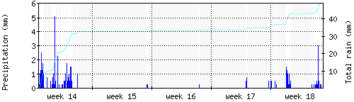 Das blaue Histogram zeigt die totale Niederschlagsmenge (oder deren Wassergehalt) in mm während des Messintervals. |