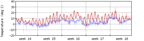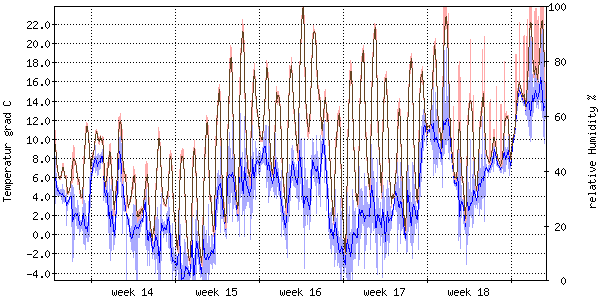 Die rote Kurve zeigt die Temperatur, die hellrote Fläche zeigt den Bereich zwischen höchsten und niedrigsten Temperatur während des Messintervals. Die blaue Kurve zeigt den Taupunkt, also die Temperatur, bei der sich Tau zu bilden beginnt. |