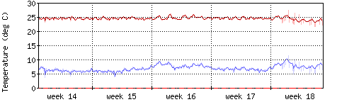 Die rote Kurve zeigt die Innentemperatur,die hellrote Fläche zeigt den Bereichh zwischen höchster und tiefster Temperatur während des Messzeitraums. |
