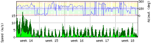 Der untere Teil des Graphen zeigt in hellgrün die mittlere Windgeschwindigkeit, die Spitzengeschwindigkeit ist dunkelgrün dargestellt, die zugehörige Skala findet sich am linken Rand. Der obere Teil des Graphen zeigt das Wind-Azimut in blau, die Skala steht am rechten Rand. |