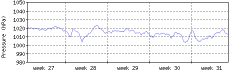 Der blaue Graph zeigt den mittleren Luftdruck, der Bereich zwischen grösstem und kleinstem Druck während des Messintervals ist in hellblau dargestellt. |