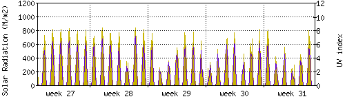 Das goldene Histogramm zeigt die totale Sonnestrahlung in W/m^2, die Skala befindet sich am linken Rand. Die violette Kurve zeigt den UV index, mit der Skala am rechten Rand. Man beachte, dass nach Schneefall die Messwerte nicht zuverlässig sind, weil die Sensoren nicht automatisch vom Schnee befreit werden. |