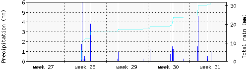 Das blaue Histogram zeigt die totale Niederschlagsmenge (oder deren Wassergehalt) in mm während des Messintervals. |