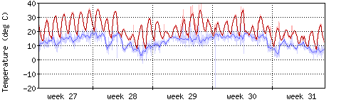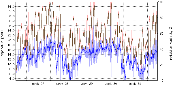 Die rote Kurve zeigt die Temperatur, die hellrote Fläche zeigt den Bereich zwischen höchsten und niedrigsten Temperatur während des Messintervals. Die blaue Kurve zeigt den Taupunkt, also die Temperatur, bei der sich Tau zu bilden beginnt. |