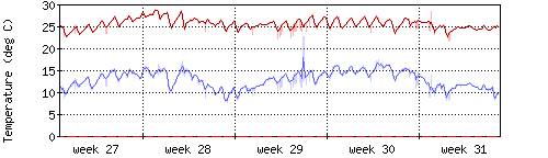 Die rote Kurve zeigt die Innentemperatur,die hellrote Fläche zeigt den Bereichh zwischen höchster und tiefster Temperatur während des Messzeitraums. |