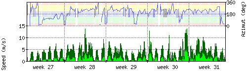 Der untere Teil des Graphen zeigt in hellgrün die mittlere Windgeschwindigkeit, die Spitzengeschwindigkeit ist dunkelgrün dargestellt, die zugehörige Skala findet sich am linken Rand. Der obere Teil des Graphen zeigt das Wind-Azimut in blau, die Skala steht am rechten Rand. |