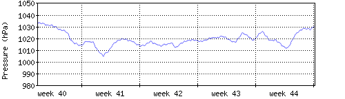 Der blaue Graph zeigt den mittleren Luftdruck, der Bereich zwischen grösstem und kleinstem Druck während des Messintervals ist in hellblau dargestellt. |