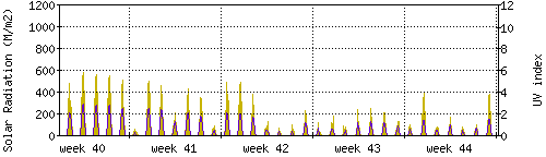 Das goldene Histogramm zeigt die totale Sonnestrahlung in W/m^2, die Skala befindet sich am linken Rand. Die violette Kurve zeigt den UV index, mit der Skala am rechten Rand. Man beachte, dass nach Schneefall die Messwerte nicht zuverlässig sind, weil die Sensoren nicht automatisch vom Schnee befreit werden. |