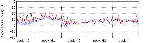 Die rote Kurve zeigt die Temperatur, die hellrote Fläche zeigt den Bereich zwischen höchsten und niedrigsten Temperatur während des Messintervals. Die blaue Kurve zeigt den Taupunkt, also die Temperatur, bei der sich Tau zu bilden beginnt. |