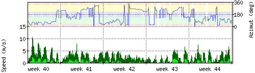 Der untere Teil des Graphen zeigt in hellgrün die mittlere Windgeschwindigkeit, die Spitzengeschwindigkeit ist dunkelgrün dargestellt, die zugehörige Skala findet sich am linken Rand. Der obere Teil des Graphen zeigt das Wind-Azimut in blau, die Skala steht am rechten Rand. |