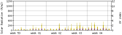 Das goldene Histogramm zeigt die totale Sonnestrahlung in W/m^2, die Skala befindet sich am linken Rand. Die violette Kurve zeigt den UV index, mit der Skala am rechten Rand. Man beachte, dass nach Schneefall die Messwerte nicht zuverlässig sind, weil die Sensoren nicht automatisch vom Schnee befreit werden. |
